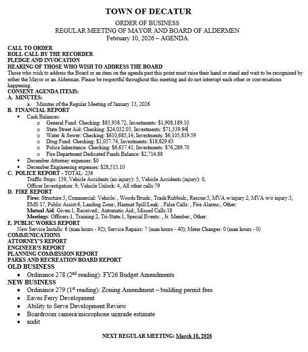 January 13, 2026 Board of Aldermen Meeting – 7pm
